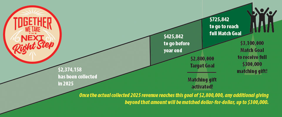 Once the actual collected 2025 revenue reaches this goal of $2,800,000, any additional giving beyond that amount will be matched dollar-for-dollar, up to $300,000.