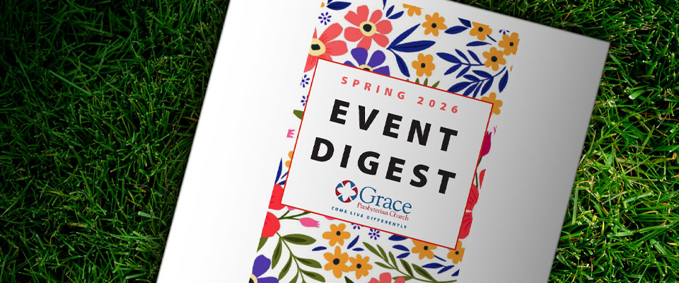 Spring is a busy time for all of us, and it is easy to miss some of the many opportunities to share life that Grace has to offer. If you are looking for ways to pray over the ministries of the church or simply want to know what's happening in the life of Grace, grab an EVENT DIGEST and get plugged in. There are so many things to be a part of--Bible studies and classes, retreats, mission trips, and other opportunities to serve--ways to live life in community as we share the gospel and share our lives. Spring 2026 Digests may be found throughout the lobby and Welcome Center--pick one up and be ready for the coming months. An online copy is available HERE.